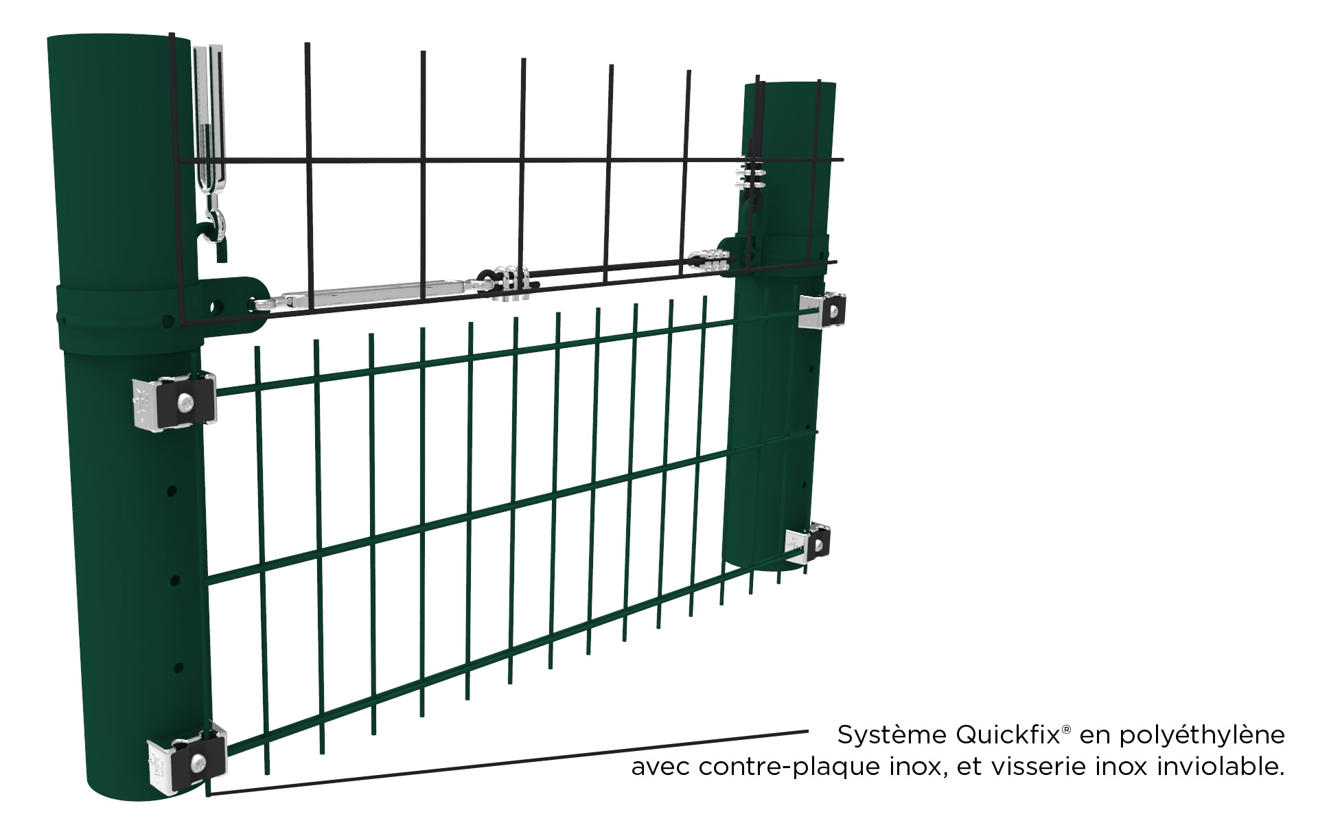 Les panneaux treillis soudés sont fixés sur les poteaux en partie basse sur 2m de hauteur grâce à notre système “Quickfix®” vissé sur les inserts M8 placés tous les 50cm (voir schéma de principe ci-contre).